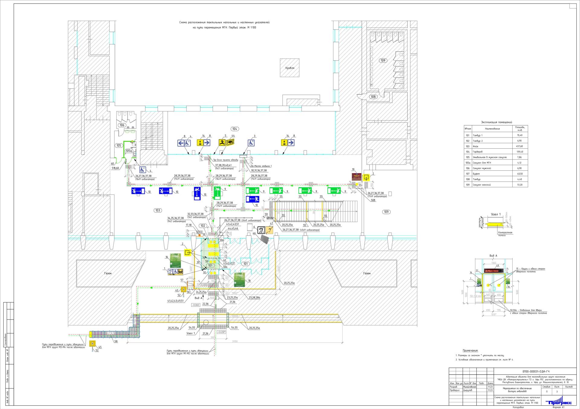 а) тактильные настенные указатели на путях перемещения МГН групп М1-М4: тактильная пиктограмма «Доступность объектов для инвалидов по зрению и по слуху, а также в креслах-колясках» (219х466 мм). Крепить перед входной дверью; тактильные пиктограммы «Выход из помещения» (150х150мм). Крепить перед выходами из фойе в тамбур, из тамбура в тамбур и из тамбура на улицу со стороны дверных ручек (рабочих створок); тактильные таблички на композитной основе, 300x400 мм (с указанием наименования учреждения и режимом работы, на двух языках, дублированная шрифтом Брайля). Крепить перед входом с улицы в тамбур с обеих сторон дверного проема; мнемосхема тактильная 630x800 мм с планом и назначением помещений (первый этаж). Мнемосхему разместить на отдельностоящей стойке с левой стороны при входе из тамбура в фойе; контрастная маркировка в форме круга диаметром 0,2 м стеклянных полотен дверей. Маркировку нанести на одном уровне (от 1,3 до 1,4 м до центра) с обеих сторон дверных полотен тамбурных дверей; маркировка дверных проемов тамбуров контрастной лентой.