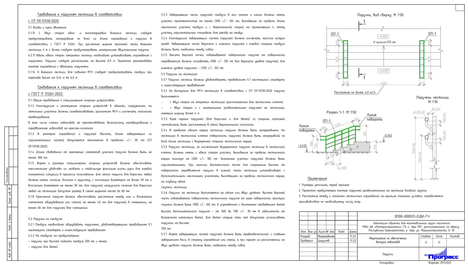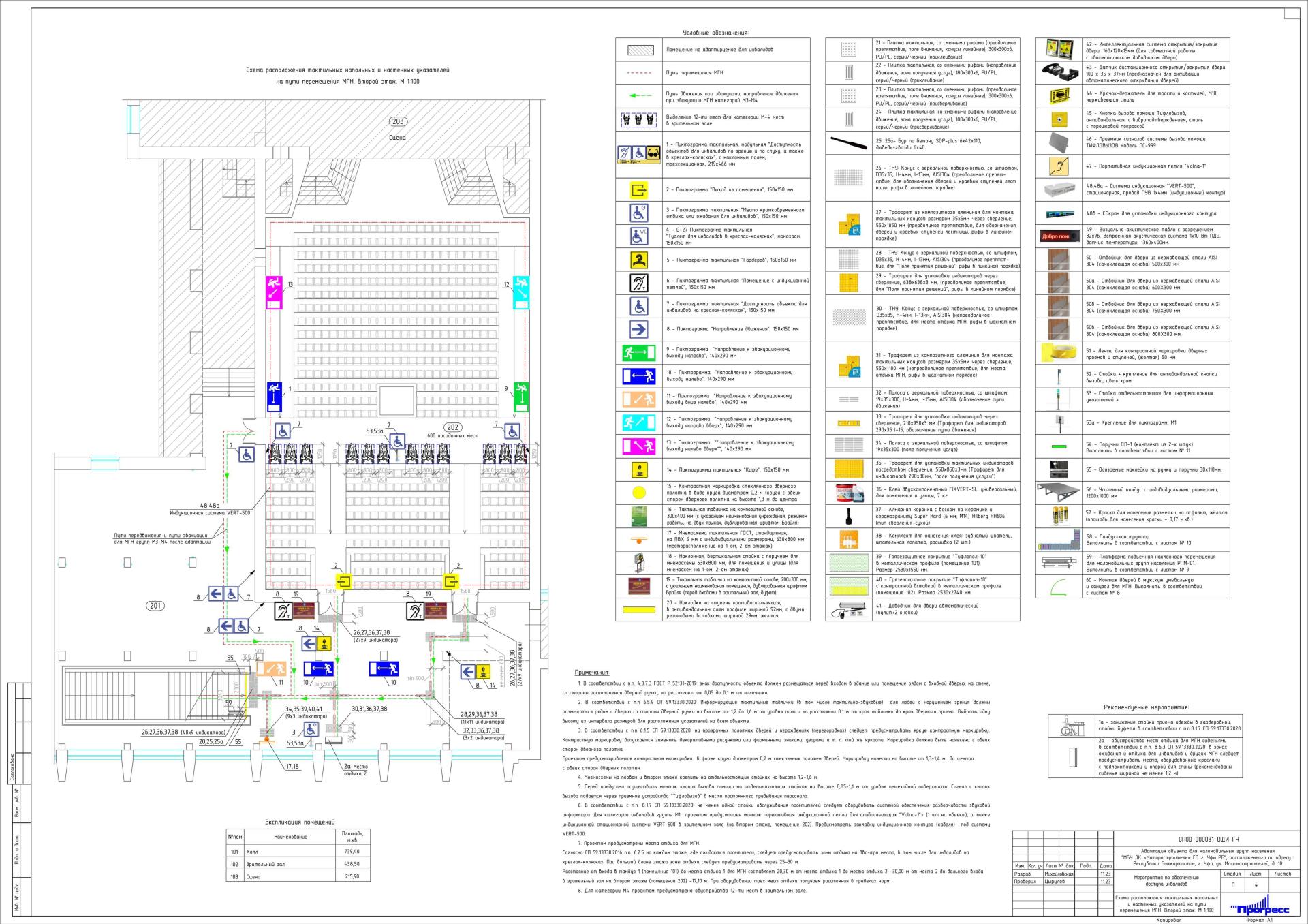 Также проектом предусмотрены следующие мероприятия: для инвалидов категорий мобильности М3 и М4 для преодоления лестницы - поставить пандус конструктора, а для преодоления крыльца произвести монтаж усиленного металлического пандуса с жестким креплением к крыльцу. Также предполагается монтаж лестничных ограждений с нанесением тактильных наклеек с внутренней стороны поручней; монтаж антивандальных кнопок вызова помощи перед лестницей на отдельно-стоящей стойке и перед пандусом крыльца. Сигнал с кнопок вызова подается через приемное устройство «ТИФЛОВЫЗОВ» в место постоянного пребывания персонала. В проекте заложена установка тактильно-визуального табла над центральным входом в здание, а для беспрепятственного пользования входных дверей и дверей из тамбура в холл предусмотрены доводчики для двери автоматические, применяются совместно с интеллектуальной системой и датчиком открытия/закрытия дверей. Для категорий М3-М4 отбойники для дверей тамбура из нержавеющей стали (устанавливаются с двух сторон дверного полотна).