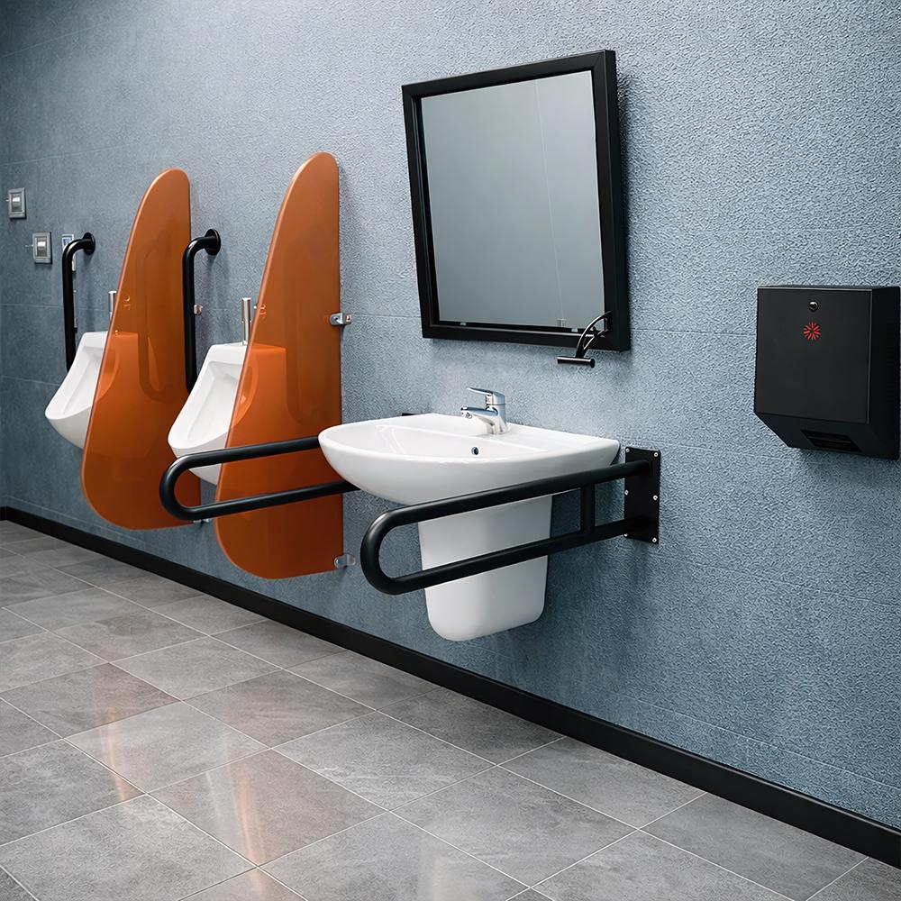 - Санузел для МГН: кабина не менее 1,65×2,2 м, дверь с открыванием наружу или складная.