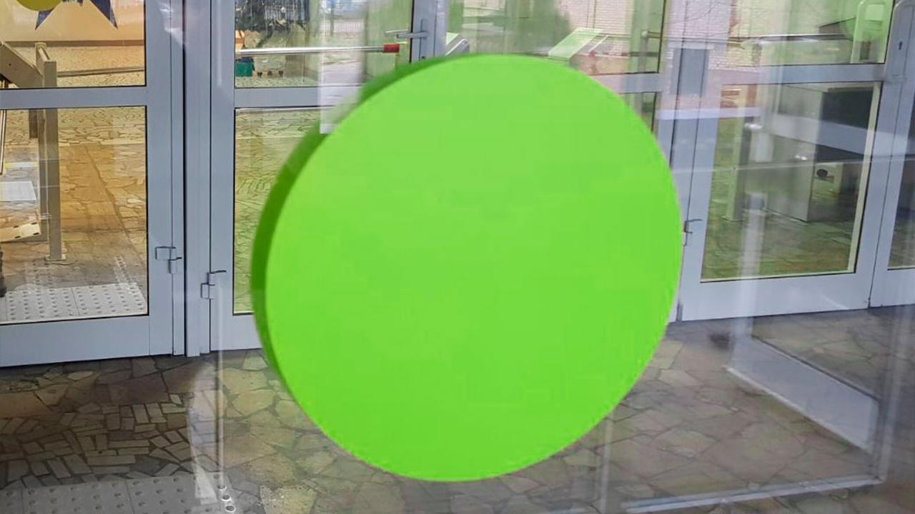 Прозрачные полотна дверей должны быть обозначены яркой полосой в форме прямоугольника или круга на уровнях 1,3–1,4 м и 0,9–1,0 м. Для этих целей оптимально подходит пожарная разметка с использованием светонакопительныхматериалов, которая обеспечивает видимость в условиях задымления.