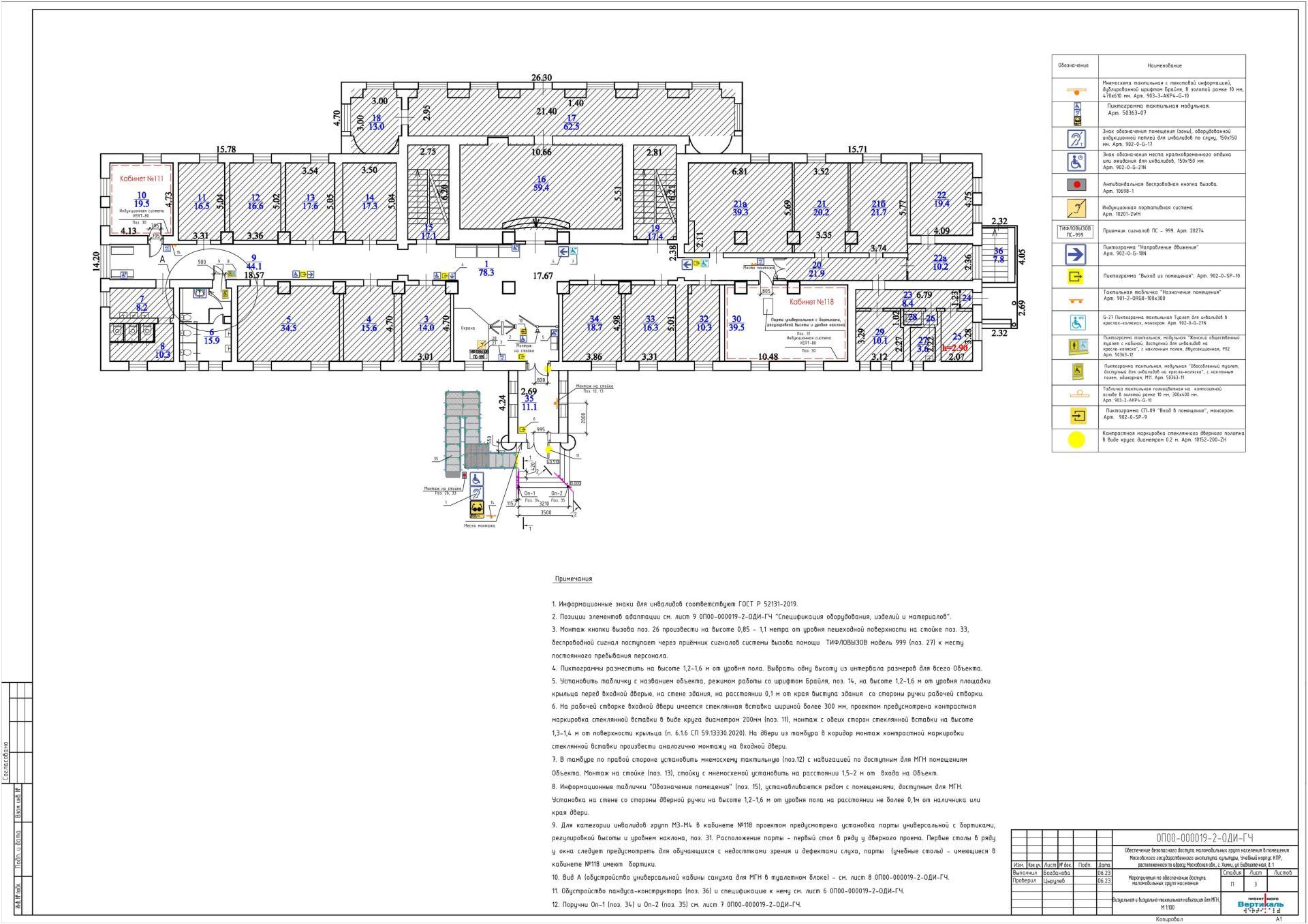 - Входная группа. Тактильные указатели, противоскользящие накладки на ступени, пандус/подъемная платформа, кнопка вызова помощи, поручни.