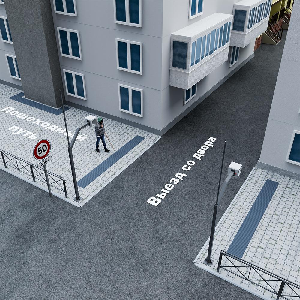 - Тактильная навигация.Для ориентирования людей с нарушением зрения на путях движения предусматриваются тактильно-контрастные указатели. Так, перед нерегулируемым пешеходным переходом укладывается предупреждающая полоса с продольнымирифами, расположенными в направлении движения через переход,на расстоянии 300мм от бордюра. Подобрать тактильную плиткудля создания предупрждающей полосы можно в электронном каталоге Тифлоцентра «Вертикаль».